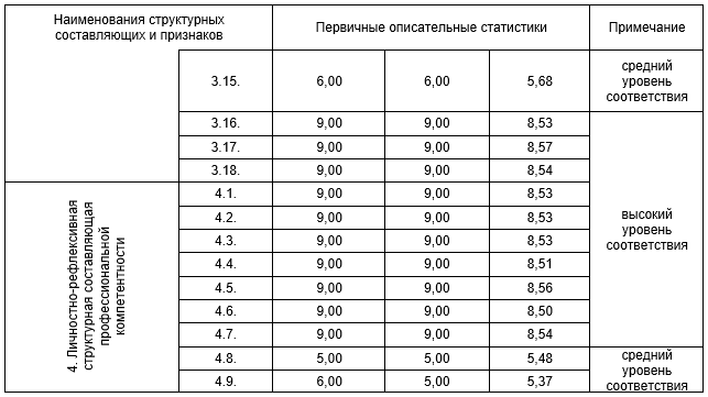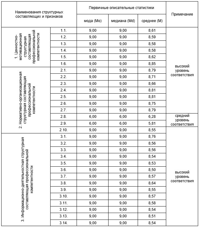 Из представленных в таблице 1 данных видно, что, по мнению экспертов, из 43 выявленных признаков 5 признаков имеют средний уровень соответствия. Следовательно, они в наименьшей степени значимы для профессиональной компетентности современных педагогических кадров. Остальные 38 компонентных блоков, по мнению экспертов, получили высокий уровень соответствия (моды Мо: min - 9 баллов, max – 9 баллов; медианы Md: min - 9 баллов, max - 9 баллов; среднеарифметические M: min - 8,5 баллов, max - 8,85 баллов). Экспертная оценка (n=177) по специально разработанному опроснику позволила уточнить актуальную структуру профессиональной компетентности педагогических кадров в условиях происходящей в настоящее время трансформации образования в Республике Узбекистан. Для этого 38 компонентов, получивших высокие экспертные оценки, были системно-логически объединены по смысловому содержанию в 4 генеративных блока. Это блоки: 1) ценностно-мотивационный, 2) нормативно-организационнуый, 3) информационно-деятельностный и 4) личностно-рефлексивный. По мнению экспертов, названные блоки целесообразно интерпретировать как актуальные структурные составляющие профессиональной компетентности современных педагогических кадров в условиях трансформации образования и могут применятся как соответствующие критерии оценки исследуемого явления в целом. В завершении отметим, что происходящие сегодня в образовательном пространстве Республики Узбекистан трансформационные процессы, безусловно, имеют влияние на саморазвитие личности педагога. В частности, сверхбыстрое обновление информации значительно ускоряет изменения в содержании, формах, видах и направлениях педагогической деятельности, а постоянная изменчивость общественных требований и обстоятельств ее осуществления обостряют проблему сохранения высокой профессиональной активности педагогических кадров на протяжении всей карьеры. Становится очевидным, что к подобным условиям может адаптироваться лишь педагог, который работает над собой, самостоятельно приобретает новые знания и навыки. Все это весьма актуализируют дальнейшее исследование структуры профессиональной компетентности современного педагога, прогрессивных моделей обучения специалистов в последипломный период в условиях трансформации образования с целью их уточнения, обновления.