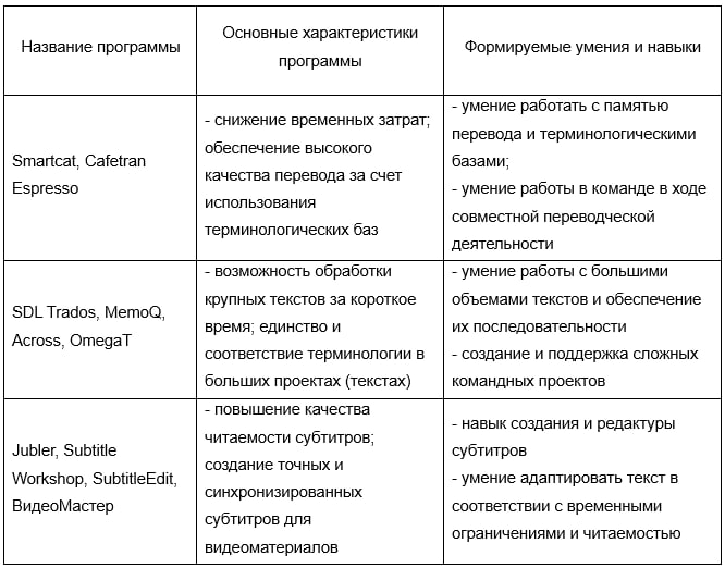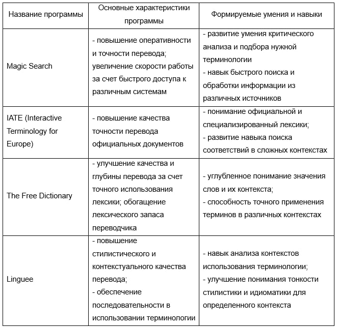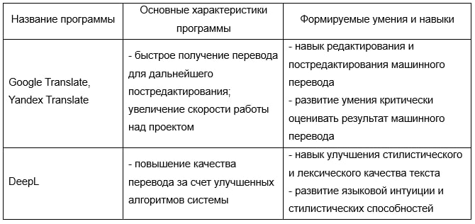 Как показывает практический опыт, применение проектно-технологическая модели обучения системно-автоматизированному переводу, позволило системно влиять на совершенствование умений студентов использовать лингвистические информационные ресурсы, успешно осваивать специальную лексику и иноязычный языковой материал, что в целом повышает эффективность профессиональной иноязычной подготовки будущих специалистов в области перевода. Дальнейшие перспективы данного исследования связаны с разработкой специальных учебных курсов, основанных на междисциплинарном подходе в области перевода, межкультурной коммуникации и применения цифровых лингвистических ресурсов.