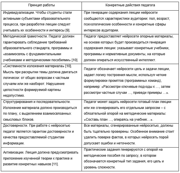 Abstract Key words: lecture creation methodology, teaching quality assessment, neural networks, teaching techniques. ---------------- Система образования – это динамичная и постоянно развивающаяся структура, которая должна реагировать на социальный и технический прогресс. Нейросети (искусственные нейронные сети) являются новейшими технологиями, которые сегодня находятся на начальном этапе интеграции в образовательную систему. Нейросеть – это программный код, математическая модель, которая, анализируя массив данных, способна дать обоснованный ответ на поставленную интеллектуальную задачу [1]. Сегодня нейросети уже используются в образовании в различных направлениях: для создания персонализированных программ обучения, управления образованием, анализа результатов, контроля и корректировки образовательного процесса, для автоматизации рутинной работы педагога [1]. Именно на последнем пункте будет сосредоточено внимание в этой статье. Нейросеть может стать инструментом для оптимизации подготовки преподавателя к занятиям, сохраняя его время и ресурсы. В частности, нейросеть способна помочь педагогу в подготовке различных типов заданий и материалов для занятий [2]. Однако, на сегодняшний день апробированные способы подготовки материалов при помощи нейросетей практически отсутствуют, как отсутствуют конкретные рекомендации или сформулированные принципы работы педагогов с нейросетями. Для эффективного использования нейросетей требуется исследовать возможные пути их приложения к образовательному процессу, оценить эффективность, а также разработать конкретные технологии и методики использования нейросетей преподавателями. Целью приведенного в данной статье исследования является оценка эффективности нейросетей как инструмента для оптимизации работы педагога. Задача исследования – определить, способна ли нейросеть стать инструментом для подготовки к лекционным занятиям, сохраняя эффективность и качество обучения, а также сформулировать конкретные принципы для работы педагога с нейросетями. К обсуждению и изучению использования нейросетей в образовании призывают многие исследователи, например, Е.Н. Ивахненко и В.С. Никольский [3]. При этом исследователи выделяют как положительные стороны работы с нейросетями, так и отрицательные. С одной стороны, нейросеть превосходит человека по возможностям обработки больших массивов информации и скорости работы [2]. Новые технологии делают образовательный процесс более привлекательным для студентов, которых, судя по исследованиям китайских педагогов [4], привлекает воспринимаемая простота работы с нейросетями [5]. Однако иные исследователи отмечают ограничения и проблемы, которые связаны с использованием нейросетей в образовательном процессе. Среди них выделяют: недостоверность информации и ошибки в данных, предоставляемых нейросетью ChatGPT, юридические вопросы, касающиеся авторских прав и возможного плагиата в сгенерированных материалах [6]. Исследования П.В. Сысоева [2] свидетельствуют о том, что интеграция нейросетей в российскую систему образования «находится на начальной стадии», а «у преподавателей высшей школы отсутствуют системные представления об организационном, дидактическом и методическом потенциале» нейросетей. Успешность интеграции зависит от степени доверия педагогов нейросетям, их осведомленности и го