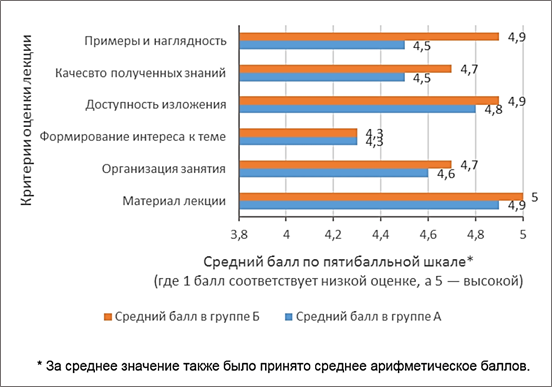Рис. 3. Результаты оценки студентами качества лекций в группах А и Б