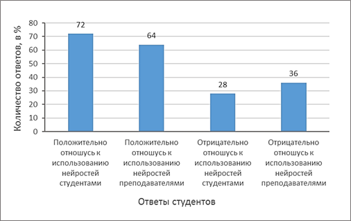 Рис. 4. Результаты опроса студентов обеих групп об их отношении к использованию нейросетей в образовательном процессе Выводы. Лекции, созданные при помощи нейросети, незначительно уступают (до 0,5 балла) по качеству лекциям, созданным педагогом, по большинству параметров: организации, содержания, результативности. Однако нейросеть показала значительно более низкие результаты в блоке «методика»: при создании проблемного вопроса, организации разнообразного и доступного изложения. Это позволяет сделать вывод о первостепенной роли педагога в организации качественного образовательного процесса. Опрос студентов позволяет сделать вывод о том, что большинство студентов группы А и группы Б (более 64%) положительно высказались о возможности использовании нейросетей для их обучения. Принимая во внимание результаты, а также перечисленные в статье особенности нейросетей, можно делать вывод, что нейросеть является эффективным средством для создания лекционных материалов при соблюдении ряда условий: педагог должен обладать необходимыми знаниями для генерации материала, руководствоваться фундаментальным методическими принципами, нести полную ответственность за поверку достоверности предоставляемой студентам информации и творчески перерабатывать полученный материал.