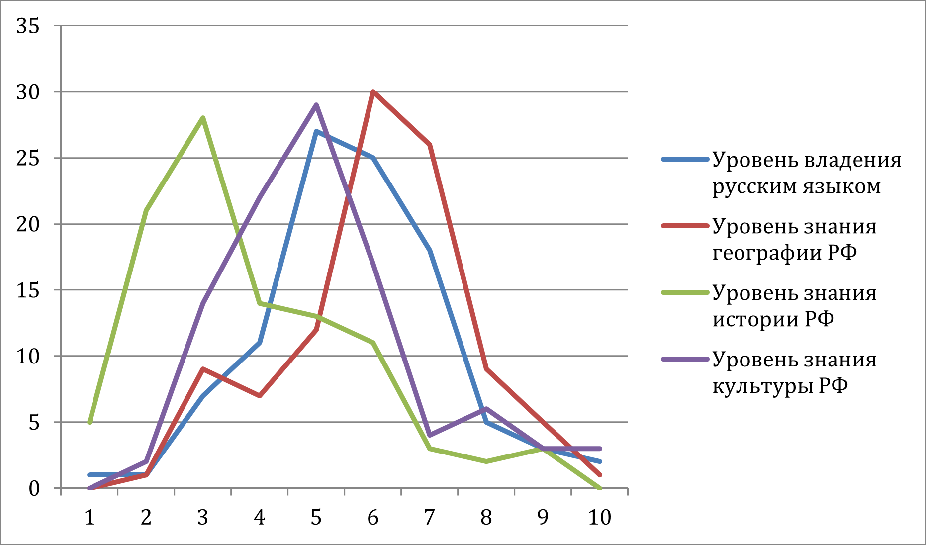 Abstract Key words: sociological survey, formation of competencies; foundations of Russian statehood; educational process; foreign students. ---------------- В российских вузах начиная с 2023/2024 учебного года появился предмет «Основы российской государственности». Эту дисциплину изучают все студенты, вне зависимости от того на какую специальность или форму обучения они поступили, а также и иностранные граждане. В 2022 г. Президент В.В.Путин на заседании Государственного Совета «О реализации молодежной политики в современных условиях» подчеркивал острую необходимость разработки такой учебной дисциплины. [1, 2]. Противостоять информационным войнам можно путём повышения уровня знаний молодёжи об истории и мировоззренческих основах страны - изучая события и явления, анализируя деятельность известных личностей, выстраивая причинно-следственные связи на основе достоверных фактов, молодой человек сможет развить навык критического мышления, его сложнее будет ввести в заблуждение. Несмотря на то, что дисциплина «Основы российской государственности» является новым курсом для системы высшего образования, уже появляются научные статьи, посвященные различным аспектам ее преподавания: рассматриваются возможности использования электронных образовательных ресурсов в рамках данной дисциплины [3, 4], затрагивается проблема формирования патриотизма и гражданственности [5, 6, 7], идет обращение к тематике традиционных ценностей [8, 9]. Вместе с тем, недостаточно рассмотрена тема особенностей восприятия дисциплины иностранными студентами, нет обращения к проблеме групп, сформированных полностью из иностранцев, не уделяется внимание мотивации и первичным знаниям, необходимым для понимания предмета. В настоящем исследовании применена общенаучная группа формально-логических методов (анализ, синтез), а также - системный подход, который позволил выявить взаимосвязь между трудностями в освоении предмета «Основы российской государственности» с базовыми знаниями студентов как русского языка, так и других предметов социогуманитарного блока. Применялись социологический опрос, контент-анализ, графическая интерпретация эмпирических данных. Был проведен социологический опрос студентов об основных трудностях, которые возникали у них в процессе прохождения курса «Основы российской государственности» (в декабре 2023 года, после промежуточной аттестации по данному предмету). В опросе, проводившимся методом анкетирования, респондентам было предложено перечислить основные трудности (не более 10), а также оценить по 10-балльной шкале свои знания русского языка, географии, истории и культуре России. В качестве респондентов выступали иностранные студенты Санкт-Петербургского политехнического университета Петра Великого, обучающиеся на первом курсе бакалавриата, представляющие все специальности: от технических до гуманитарных. В исследовании приняли участие 500 студентов (42% мужского пола, 58% женского пола, 81% в возрасте от 18 до 20 лет, 19% в возрасте от 21 до 23 лет, имели гражданство Туркменистана 25%, Китая 20%, Белоруссии 20%, Казахастана 19%, Таджикистана 9%, Узбекистана 7%). На рис. 1 представлены результаты самодиагностики респондентов уровня владения русским языком, знаний в области географии, истории и культуры РФ. Наиболее низкие оценки собственных знаний студентами были выставлены по истории, большинство респондентов оц