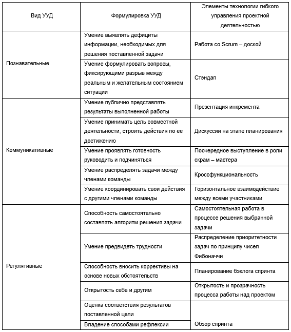 Таким образом, можно заключить, что технология гибкого управления проектной деятельностью является эффективным средством формирования универсальных учебных действий и достижения метапредметных результатов на уроках иностранного языка в основной школе. Следует также отметить, что основную школу целесообразно рассматривать в качестве первой ступени внедрения технологии гибкого управления проектной деятельностью, поскольку, начиная с раннего подросткового возраста, активно развиваются соответствующие когнитивные способности, социальные навыки и смысловые установки личности, в совокупности образующие систему универсальных учебных действий.