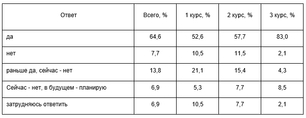 В свете вышеперечисленных особенностей обучения в военном учебном заведении реализация потребности курсантов в самообразовании возможна только при осознанной внутренней заинтересованности [3]. Настоящее исследование проводилось на базе 183-го Учебного центра Министерства Обороны Российской Федерации. Анкетирование проводилось с курсантами всех (трёх) курсов обучения и дополнялось интервью с преподавателями и курсовыми офицерами. Задачами нашего исследования явилось изучение отношения курсантов к учебной деятельности и самообразованию; определение специфики мотивации курсантов к самообразовательной деятельности; анализ особенностей учебной работы курсантов во время самостоятельной подготовки. В процессе анкетирования проводилась дифференциация ответов как по курсу обучения курсантов, так и по их возрасту. Это целесообразно, поскольку уровень дисциплины и осознанности обучения зачастую существенно меняются с возрастом, а разница в возрасте курсантов, обучающихся на одном курсе может достигать десяти и более лет. Таблица 1 Распределение ответов респондентов на вопрос «Занимаетесь ли вы самообразованием?»