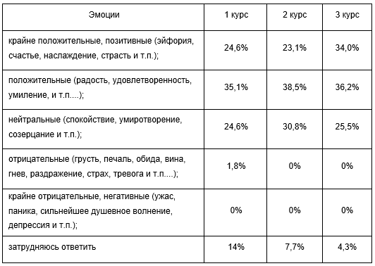 Как видно, более половины курсантов утвердительно отвечают на вопрос – занимаются ли они самообразованием. Причем, наблюдается увеличение процента положительных ответов по мере взросления вплоть до абсолютного большинства на третьем курсе. Это может свидетельствовать о том, что в процессе обучения по разным причинам растет осознание необходимости более глубокого изучения материалов, касающихся будущей профессии, развития общего кругозора. Незначительно, но устойчиво растет и процент собирающихся заниматься самообразованием в будущем. Для анализа мотивационных характеристик самообразовательного процесса в анкету исследования были введены вопросы, касающиеся эмоционального состояния респондентов во время или после самообразовательной деятельности, а также вопросы о мотивах и причинах избрания ими профессии военнослужащего. Самообразовательная деятельность по своему смыслу является в большей степени внутренне мотивированным процессом, поскольку предполагает систематически повторяющийся, осознанный выбор в пользу выделения времени и когнитивных усилий на тот или иной предмет обучения. В большинстве случаев подобные усилия дают обучающемуся очень мощную положительную обратную связь, связанную с успехами в определённых видах деятельности. Со временем у личности может возникнуть потребность к самообразованию. Таблица 2 Распределение ответов респондентов на вопрос «Какие эмоции вы чаще всего испытываете в процессе самообразования?»