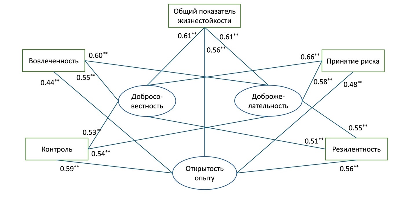 Рис. 1. Корреляционная плеяда показателей опросников «Большая пятерка» и «Тест жизнестойкости» С. Мадди Условные обозначения: ** - p<0.01. Все связи положительные. Корреляционный анализ позволил выявить взаимосвязи между личностными чертами и уровнем жизнестойкости. В частности, выявлено, что такие показатели жизнестойкости, как вовлеченность, контроль, принятие риска, резилентность и общий показатель, имеют положительную взаимосвязь с личностными факторами «открытость опыту», «доброжелательность» и «добросовестность». Это указывает на роль позитивных личностных качества в преодолении трудностей в процессе изучения русского языка. Кроме того, мы выявили, что показатель «добросовестность» имеет положительную связь с результатом теста русского языка (r=0.38, p<0.01). А поскольку добросовестность значимо взаимосвязана со всеми показателями жизнестойкости, то доброжелательность и открытость опыту также, хотя и опосредованно, взаимосвязаны с успешностью освоения русского языка, способствуя его усвоению. Но, поскольку корреляционная зависимость всегда двусторонняя, и успешность изучения русского языка также благотворно влияет на развитие позитивных личностных качеств доброжелательности и открытости опыту. Заключая отметим, что среди китайцев, изучающих русский язык, преобладают лица с гуманитарной направленностью профессии и высоким образовательным уровнем. Результаты анализа данных психологического исследования показали, что в процессе изучения русского языка личностные факторы играют важную роль. Добросовестность, значимо связанная с успешностью освоения русского языка, имеет при этом взаимосвязи с различными характеристиками жизнестойкости. Значимые взаимосвязи показателей жизнестойкости и открытости подтверждают значимость готовности студентов к новому знанию и новой среде. Тесная связь между жизнестойкостью и добросовестностью показывает, что для изучения сложного иностранного языка (в данном случае - русского) необходим высокий уровень ответственности. Положительная связь между показателями жизнестойкости и доброжелательностью свидетельствует о том, что стремление к установлению позитивных социальных связей помогает повысить уровень жизнестойкости и найти поддержку от окружающей среды. В дальнейшем мы планируем провести сравнительный анализ полученных результатов с результатами опроса китайцев, не изучающих русский язык, что позволит уточнить психологические закономерности изучения иностранного языка.