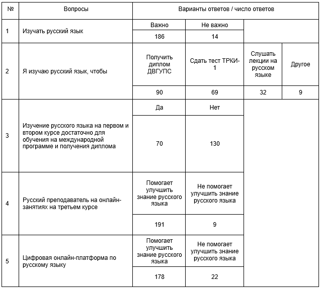 Очевидным способом решения данных проблем было бы усиление языковой подготовки обучающихся, повышение требований к владению ими русским языком «на входе», однако на законодательном уровне до сих пор не закреплено требование к уровню владения русским языком при поступлении в вуз. Более того, отсутствуют четко установленные требования к выпускнику-иностранцу в части владения языком. В документах не оговорено, что выпускник не может защищать выпускную квалификационную работу на родном языке посредством переводчика. Разрешены онлайн-защиты дипломов и онлайн-работа государственной экзаменационной комиссии. Все это обуславливает низкий уровень мотивации китайских студентов к изучению русского языка. В этих условиях достижение высокого качества образования иностранных студентов видится прежде всего за счет усиления языковой подготовки посредством изучения русского языка как иностранного. ДВГУПС предъявляет требования к владению русским языком на уровне В-1 для студентов совместных и сетевых образовательных программ. С 2023 года Центр русского языка организует выездные сессии лингводидактического тестирования в вузы-партнеры, с которыми реализуются совместные образовательные программы. В ДВГУПС также проводится обязательное тестирование студентов включенного обучения. И само тестирование и подготовка к нему являются мощным стимулом для изучения русского языка. В 2024 году нами было проведено анкетирование студентов третьего курса, обучающихся по траектории 4+0 в Даляньском транспортном университете. В опросе участвовали 200 студентов, которым были заданы следующие вопросы: «Важно ли изучать русский язык?», «Какова основная мотивация при изучении вами русского языка?», «Какое обучение кажется вам более эффективным: с преподавателем или на цифровой платформе?» и др. Результаты опроса представлены в таблице 1. Таблица 1