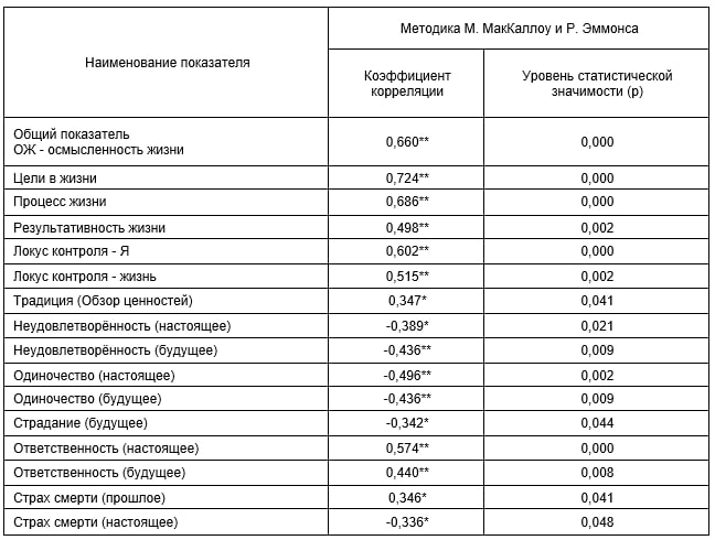 Примечание: *p≤0,05 и **p≤0,01 Анализ взаимосвязей показывает, что чем более человек благодарный, тем он больше склонен осмысленно участвовать в собственной жизни, меньше чувствовать себя одиноким и неудовлетворенным жизнью, меньше видит для себя страданий в будущем, и наоборот. Интересна связь со страхом смерти в прошлом и настоящем – чем более вероятна встреча с опытом страха смерти в прошлом и меньше его сейчас, тем человек более благодарный, и наоборот. Так же нас очень заинтересовала взаимосвязь важности для респондентов ценности традиций с благодарностью - чем человек более благодарный, тем больше у него выражена ценность традиций. И наоборот, чем больше человек ценит традиции, тем более он благодарный. Опираясь на содержание ценности традиции, которое вложено автором методики [3], можно сказать, что чем более человеку свойственно уважение традиций, принятие культуры, готовность к смирению и умеренности в своей жизни, тем более он благодарен этой жизни и наоборот. Кроме связи с благодарностью, обнаружена прямая взаимосвязь между важностью традиций, общей осмысленностью жизни и авторством своей жизни. Это может говорить о том, что не просто человек, верный традициям становится благодарным, а тот, кто осмысленно уважает и принимает обычаи и идеи, которые существуют в культуре, понимает их важность и осознанно следует им. Поскольку среди респондентов не оказалось достаточного количества людей, находящихся в глубоком духовном кризисе, реализовать нашу цель в полной мере не получилось, но выделилась группа респондентов, которые находятся сейчас (или находились в прошлом) с состоянии глубокого духовного кризиса. Мы решили присмотреться к этой группе. Группа разделилась на 2 части: 1) 5 человек, у которых в прошлом был кризис, и они его пережили (сейчас такого кризиса нет), 4 из них показывают высокий уровень осмысленности жизни и склонности к благодарности; 2) 3 человека, которые находятся в кризисе сейчас и/или прогнозируют это состояние в будущем, показывают низкий уровень осмысленности жизни и склонности к благодарности. Эти результаты поддерживают нашу мысль о том, что благодарность связана с духовным кризисом. И при этом невозможно сказать о характере этой связи: это взаимосвязь или причинно-следственная связь. Мы можем предполагать, что пережитый кризис может повышать благодарность. Вместе с тем, возможно благодарность была присуща респондентам изначально, и способствовала успешному выходу из кризиса и нынешнему стабильному состоянию. Это требует дальнейшей проверки, поэтому в следующем исследовании мы планируем работать над пониманием характера этой связи. Таким образом, исследование показывает, что существует взаимосвязь склонности к благодарности и определенных личностных особенностей. Существуют определенные условия возникновения и развития благодарности как эмоциональной реакции и как диспозиционной черты личности. Найденные взаимосвязи могут рассматриваться как условия развития именно личностной склонности к благодарности. Эти условия важно изучать, в результате могут быть получены данные, полезные в решении проблем воспитания детей, проблем личностного и социального здоровья.
