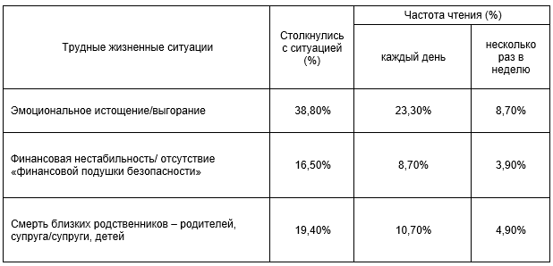 Abstract Key words: psychology of reading; difficult life situation; personality psychology; stress and anxiety. ---------------- Введение. Анализируя категорию «жизненных ситуаций» в разрезе психологических наук, мы непосредственно прибегаем к понятию «ситуация», которая в свою очередь выступает в качестве некого «проявителя» внутренних детерминант человеческого бытия. Рассмотрение ситуационных и психологических переменных позволяет исследовать человека более многомерно с учетом психологических, социальных, политических, экономических и других важных детерминирующих направлений жизни человека [1]. Таким образом, появляется возможность категоризировать ситуации и изучить жизнь современного человека с учетом ситуаций, в которых он оказывался и которые имели значение для его меняющейся картины мира. Термин «трудная жизненная ситуация» в употребление вошел в обиход не так давно, буквально в начале прошлого века. Термин «трудная жизненная ситуация» (далее ТЖС) синонимичен понятиям «сложная жизненная ситуация», «кризисная жизненная ситуация», но не тождественен понятию «экстремальная жизненная ситуация», «ситуация жизненного риска». Стоит отметить, что ТЖС имеет больше негативный оттенок, чем позитивный, хотя ситуацию как таковую мы рассматриваем в дуальной системе: положительная-отрицательная. У современных авторов мы можем увидеть обзоры становления терминологии и методологии ТЖС. Так, работе В.В. Мышко и С.И. Баляева жизненные ситуации – это различные события и обстоятельства, в которых оказывается человек в ходе своей жизнедеятельности. Жизненная ситуация в психологии определяется как обстоятельства, в результате наступления которых потребности и ценности человека приобретают новое качество и субъективный смысл, что, как правило, приводит к заметному изменению его поведения и общих взглядов на жизнь [2]. Наша задача определить ТЖС и их специфику исходя из особенностей жизнедеятельности современного человека. За последние десять лет можно отметить следующие важные события всероссийского и мирового значения, которые прошили в стране и которые повлияли на жизнь россиянина: присоединение Крыма к территории России (2014), обвал курса рубля (2014), семидесятилетие Победы в Великой Отечественной Войне (2015), допинговый скандал (2016), повышение пенсионного возраста (2018), рождение первых генетически модифицированных людей (2018), распространение вируса COVID-19 (2020), Специальная Военная Операция (2022), объявление ВОЗ об окончании пандемии COVID-19 и отмене чрезвычайной ситуации в области здравоохранения (2023). Также здесь не упомянуты события, связанные с катастрофами техногенного и террористического характера и, конечно, события личной жизни каждого человека (смена работы, смерть близкого, сложности с здоровьем и т.п.). В это же время печатная пресса и бумажные книги переживают кризис, интерес к печатным СМИ падает. Тиражи снижаются, издания массово уходят в интернет. Получает распространение электронных книг-«читалок». Комплекс «Российская книжная палата» вместе с Российской государственной библиотекой опубликовали данные о выпуске книг и брошюр за первый квартал 2024 года. За первые три месяца этого года сократилось количество выпущенных книг и брошюр на 2,9% по сравнению с аналогичным периодом 2023 года, а совокупный тираж снизился на 4,4%. Особенно отчетливо сокращение затронуло книги