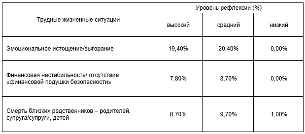 Наиболее распространенной трудной жизненной ситуацией оказалось эмоциональное истощение/выгорание, которое отмечалось у 38,80% , при этом 23,30% таких респондентов читают ежедневно. Финансовая нестабильность и отсутствие «финансовой подушки безопасности» также являются значительными факторами стресса, о чем свидетельствует 16,50% респондентов, 8,70% таких респондентов также читают ежедневно. Смерть близких родственников (родителей, супруга/супруги, детей) является еще одной тяжелой жизненной ситуацией, с которой столкнулись 19,40% респондентов за последние три года. Стоит отметить, что в этой группе каждый день читают 10,70% испытуемых. Также можно отметить, что респондентам с такими ТЖС свойственно чтение несколько раз в неделю, нечитающих среди них нет. Такое распределение частоты чтении может свидетельствовать о том, что респонденты могут выбрать чтение как способ преодоления ТЖС. Таблица 2 демонстрирует уровень рефлексии участников в контексте различных трудных жизненных ситуаций. Таблица 2 Уровень рефлексии в трудных жизненных ситуациях
