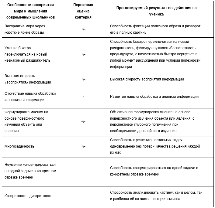 Для того, чтобы учитель воспитал успешного ученика, необходимо выстроить такую систему подачи/передачи знаний и умений, в которой современное восприятие информации не мешало бы системности мышления, а системность мышления, в свою очередь, не тормозила скорость восприятия и усвоения информации. Задачи, которые решаются в процессе успешного освоения курса математики (здесь специально не говорится об успешности сдачи итогового экзамена) и являются теми задачами, которые могут решать хорошие современные специалисты: