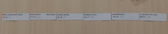 Рис. 7. Карточки выставляются по возрастанию чисел в ответе. С помощью этой методики можно интегрировать математику с русскими языком и литературным чтением. Для успешного освоения тем русского языка предлагается использовать пазлы. Например, при освоении темы «Предложения»: