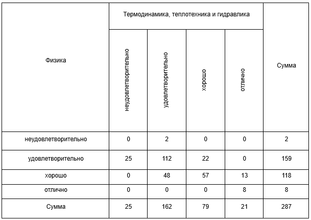 Бесспорно, отметки за вышеперечисленные дисциплины и курсы могут быть субъективными, так как их выставляют разные преподаватели с разными подходами к оцениванию. Тем не менее, статистическая достоверность результатов обеспечивается за счет большого объема данных, который позволяет сгладить влияние субъективности в оценивании знаний студентов. Для оценки влияния уровня освоения физики на дальнейшую образовательную деятельность обучающихся применялся корреляционный анализ. Исходные данные представляли собой итоговые отметки по вышеозначенным предметам за несколько лет, таким образом, анализ проводился среди значительного количества студентов одного возраста. Всего по специальности 15.02.06 Монтаж, техническая эксплуатация и ремонт холодильно-компрессорных и теплонасосных машин и установок (по отраслям) были проанализированы результаты 287 обучающихся в период 2018 - 2024 год. В качестве количественного инструмента исследования нами был выбран коэффициент полихорической сопряженности Чупрова, характеризующий тесноту связи между качественными признаками. Подробно данный метод описан в [9]. В гуманитарных науках критерий оценивания коэффициента сопряженности Чупрова следующий: зависимость считается значимой при значении коэффициента, равном 0,2; при достижении значений, равных 0,3, зависимость можно рассматривать как сильную. В противном случае зависимость рассматривается как слабая. На первом этапе исследования составлялись таблицы распределения обучающихся согласно диапазону выставляемых оценок от 2 («неудовлетворительно») до 5 («отлично»). Помимо студентов, имеющих положительные оценки по рассматриваемым дисциплинам, в таблице также учитывались и неуспевающие студенты, имеющие академические задолженности на момент проведения исследования и числящиеся в составе обучающихся. В качестве примера приведем Таблицу 1, в которой отражены отметки по физике, изучаемой студентами на первом курсе, и технической дисциплине профессионального цикла «Термодинамики, теплотехника и гидравлика», которую студенты изучают на втором курсе. Таблица 1 Распределение обучающихся по сравниваемым оценкам