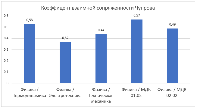 где r — число строк таблицы сопряженности, с — число столбцов таблицы сопряженности; fij, - элементы таблицы сопряженности, i = 1, 2, …, c, j = 1, 2, …, r; ni и mj – суммы строк и столбцов таблицы сопряженности соответственно. В рамках нашего исследования было получено значение коэффициента взаимной сопряженности Чупрова для физики и термодинамики k = 0,53, что может быть интерпретировано как тесная связь. Перечень дисциплин, анализируемых в настоящей работе, а также рассчитанные коэффициенты взаимной сопряженности Чупрова представлены на диаграмме 1.