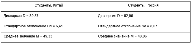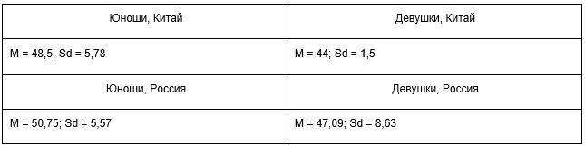 Среднее значение уровня психологического благополучия как у китайских, так и у российских студентов в целом удовлетворительно, но не слишком высоко, исходя из максимально возможных 70 баллов. Для сравнения двух групп в связи с отсутствием нормальности распределения был выбран непараметрический U-критерий Манна-Уитни. Получен результат: Uэмп=427, критические значения Uкр=292 (p≤0,01); 338 (p≤0,05), вне зоны значимости. Подтвердилась альтернативная гипотеза – между выборками китайских и российских студентов нет достоверных различий. В ходе вычисления средних значений показателей благополучия среди студентов из Китая и России были получены также данные с учетом пола опрошенных, представленные в таблице 2. Таблица 2 Средние значения и стандартные отклонения для показателя субъективного благополучия в выборках китайских и российских студентов с учетом пола