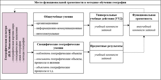 Рис. 1. Место функциональной грамотности в методике обучения географии Одним из ключевых компонентов географической культуры является географическая картина мира, которая представляет собой синтез естественно-научной и общественно-научной составляющих. В курсе «География России» это достигается через изучение природы и хозяйства страны — как в масштабах всей территории России, так и отдельных регионов. Подобный подход соответствует положениям глобальных компетенций, рассматриваемых как компонент функциональной грамотности. Кроме того, курс «География России» предполагает уверенное владение языком географии, что даёт возможность работать с терминами, характерными для данной науки: топонимами, этнонимами, географическими планами и картами. Владение этими элементами способствует развитию навыков работы с текстом, то есть читательской грамотности, также входящей в структуру грамотности функциональной. Географическая наука включает в себя множество методов: картографический, статистический, экономико-математический и др., которые тесно связаны с контекстами, требующими умения работать с числовой информацией. В рамках изучения географии России эти методы позволяют анализировать содержимое карт, диаграмм, а также статистические данные (например, демографические) о стране и её отдельных районах. Умение интерпретировать подобные числовые сведения и формулировать обоснованные выводы является важной частью математической грамотности в географии. Географическое мышление содействует выявлению проблем в разных жизненных ситуациях, постановке целей, разработке алгоритма решения и проведению эксперимента для проверки гипотез. При изучении географии России особое внимание уделяется анализу причинно-следственных связей, позволяющих ученикам прогнозировать возможные изменения в ходе своей деятельности. К примеру, понимание взаимоотношений между климатом, почвами и сельским хозяйством помогает определить благоприятные территории для выращивания культурных растений; анализ связи между уровнем экономического развития страны, темпами воспроизводства населения и прогнозом изменения полового состава населения служит основой для формирования естественнонаучной грамотности. Таким образом, в современных условиях развития географического образования географическая культура личности не теряет своей актуальности, а способы её формирования и применения в реальной среде могут опираться на практику использования функциональных навыков. Курс «География России» обладает широкими возможностями для придания учебному процессу реального жизненного акцента при решении задач, что способствует развитию функциональной грамотности и, в конечном счёте, совершенствованию географической культуры учащихся.