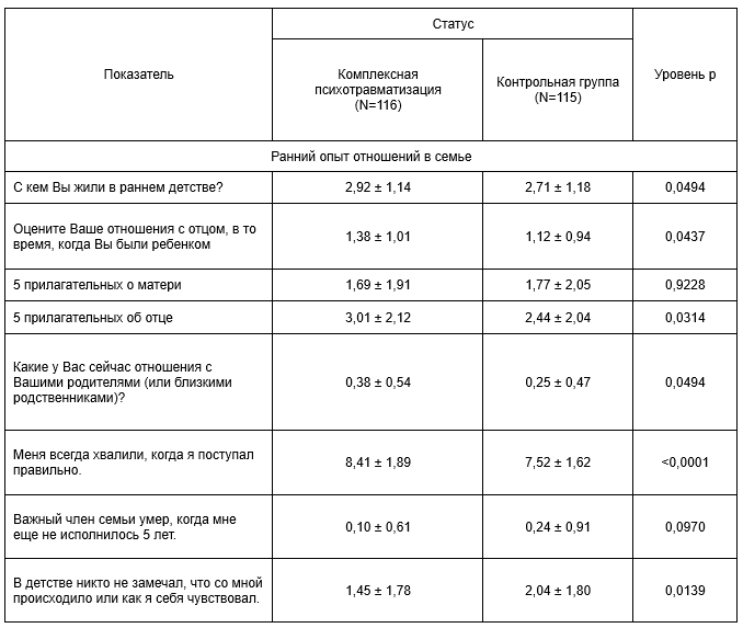 Взрослые из контрольной группы при описании своего раннего опыта реже сообщают, что «в детстве никто не замечал, что со мной происходило или как я себя чувствовал» (в среднем на 0,6 балла; р=0,0139). Обследуемые с комплексным психотравмирующим опытом реже получали эмоционально положительное подкрепление в детстве (в среднем на 0,9 балла; р<0,0001), что могло изменить на их самооценку и мотивацию к социальной активности. При наличии политравмы люди чаще чувствовали себя игнорируемыми в детстве, что затрудняло их способность выражать собственные эмоции и в дальнейшем налаживать доверительные отношения во взрослой жизни (Таблица 1). Таблица 1 Специфика семейных отношений, соответствующих психической травматизации