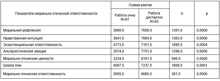 формат консультирования (n = 67). В дистанционной группе 97% имеют среднее (не медицинское) образование и курсы по нутрициологии; 3% — высшее образование (не медицинское) и специализированные курсы. Участницы исследования были привлечены через профессиональные сообщества. Критериями включения выступали: профессиональная деятельность в сфере ЗОЖ не менее одного года, активная клиентская практика в соответствующем формате, отсутствие психиатрических диагнозов и тяжёлых соматических состояний. Для диагностики уровня моральной ответственности использовался опросник ДУМЭОЛП, разработанный И.Г. Тимощуком [7]. Для оценки когнитивных искажений применялась методика И.С. Лучинкиной [10]. Статистическая обработка данных проводилась с использованием U-критерия Манна–Уитни для оценки различий между независимыми выборками. В таблице 1 представлены достоверные различия показателей моральной ответственности по шкалам методики И.Г. Тимощука. Таблица 1 Показатели моральной ответственности по методике И.Г. Тимощука (ДУМЭОЛП)