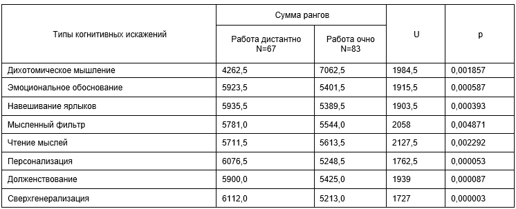 Результаты сравнения демонстрируют более высокие уровни показателей в группе с очным форматом консультирования по шкалам ДУМЭОЛП, чем в группе онлайн-консультантов. В таблице 2 представлены различия между очной и дистанционной группами по уровню выраженности когнитивных искажений [10]. Таблица 2 Достоверные различия выраженности когнитивных искажений в 2-х группах
