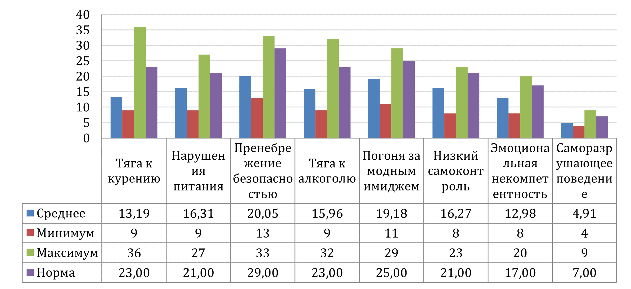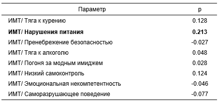 Рис. 1. Сравнение средних, минимальных и максимальных значений по параметрам нарушения здорового поведения в общей выборке с нормативными значениями Как видно, все показатели параметров нарушения здорового поведения в данной выборке находятся в пределах нормативных значений. Также мы видим, что по каждому параметру методики представлены результаты как входящие в нормативные значения, так и выходящие за их пределы. Рассмотрим корреляционные связи между индексом массы тела и параметрами методики, представленные в табл. 1. По результатам проведённого анализа мы выделили прямой коррелят индекса массы тела. Этим коррелятом является параметр «нарушения питания», то есть чем интенсивнее выражено нарушение питания, тем выше масса тела респондента. Таблица 1 Результаты анализа по методу ранговой корреляции r-Спирмена
