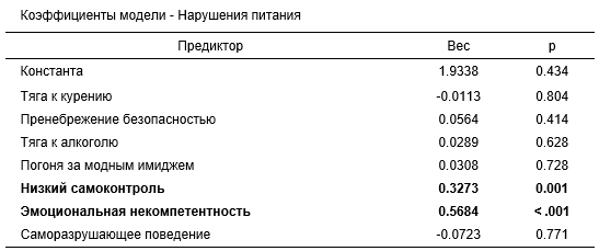 Прим.: символом “*” обозначена корреляция на уровне p<.05 Далее рассмотрены предикторы выделенного коррелята массы тела, т.е. параметра «нарушения питания». Для этого был применен линейный регрессионный анализ, результаты которого представлены в табл. 2. По результатам статистической обработки данных мы видим, что предикторами нарушения питания являются такие параметры нарушения здорового поведения как «низкий самоконтроль» (вес - 0,3237, р=.001) и «эмоциональная некомпетентность» (вес - 0,5684, р<.001). Таблица 2 Результаты анализа по методу линейной регрессии