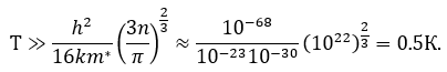 Полученное выражение представляет собой критерий перехода статистки Ферми-Дирака к статистике Максвелла-Больцмана (выбора модели электронного газа). Для того, чтобы весь электронный газ был невырожденным, то есть электроны были способны менять свои состояния при изменении температуры или включении электрического поля необходимо выполнение данного условия (5). Из представленного неравенства (5) обучающиеся делают вывод: переход к статистике Максвелла-Больцмана возможен при малых концентрациях частиц или при высоких температурах. В качестве примера рассмотрим изучение электронных свойств металлов в курсе физики твердого тела. Здесь обучающимся на практическом занятии можно предложить самим определить температуру перехода к статистике Максвелла-Больцмана. Для металлов в силу высоких концентраций электронов n~1029м-3 переход к статистике Максвелла-Больцмана возможен при температурах: