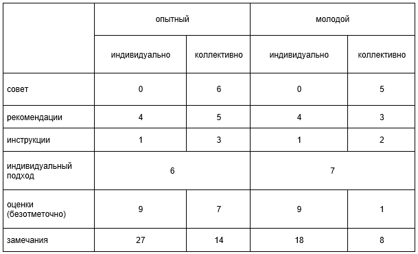 Качественное сравнение содержания деятельности опытных и молодых учителей показывает, что опытные педагоги помимо осуществления дидактических задач часто (но не всегда) пытаются передать детям прикладные знания, чтобы связать новую информацию с жизнью вокруг; у молодых педагогов в большинстве случаев акцент смещен на дидактический материал и технику выполнения заданий. Наличие схожих по виду словесных приемов (похвала и замечание-поощрение, оценка и замечание-оценка, совет и замечание-совет и др.) показало необходимость более глубокого изучения словесного воздействия педагога в ситуациях на уроке для определения, описания и классификации данных приемов. В ходе исследования без адаптивных таблиц удалось установить, что как опытные, так и молодые учителя-предметники включают эффективные вербальные стратегии речевого сопровождения подопечных в учебном процессе: когнитивные речевые средства гармонизации педагогического общения: фразы побуждения к размышлению, фразы введения новой информации, фразы дедуктивного способа введения информации, обращения и слова приветствия. Мы пришли к заключению, что для дальнейшего наиболее полного изучения речевого сопровождения наставничества учителей-предметников на уроке необходимо рассмотреть следующие приемы:
