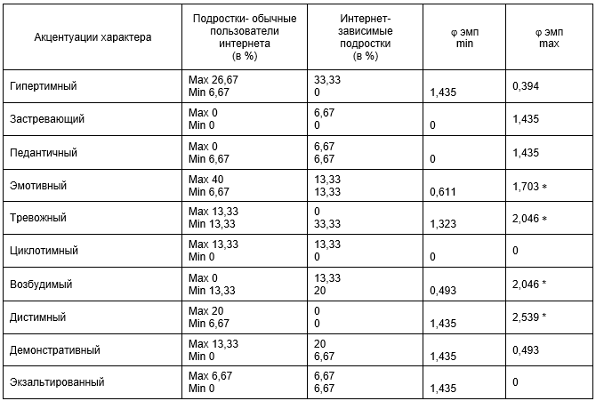 Таким образом, нами подтверждена ранее выдвинутая гипотеза о том, что подростки с интернет-зависимостью имеют особенности в проявлении акцентуаций характера и психоэмоциональных состояний. Выявленный в исследовании комплекс психологических состояний интернет-зависимых подростков следует учитывать при организации профилактики и психологической коррекции личностных отрицательных состояний индивида в данном возрасте.