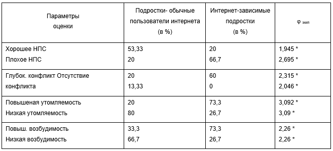 Примечание: * обозначаются статистически значимые различия. Выделены группы подростков в обеих выборках с min (0 – 4) и max (20 – 24) значениями по шкалам. Таким образом, статистическая обработка подтвердила, что подростки с интернет-зависимостью отличаются от подростков – обычных пользователей интернета тем, что у них преобладает возбудимый тип акцентуации характера. Результаты диагностики школьников с помощью цветового теста Люшера представлены в таблице 2. Анализ данных демонстрирует, что у подростков – обычных пользователей интернета преобладают показатели благополучного нервно-психическое состояния (58%); низкая возбудимость (58%) и утомляемость (70%), неглубокие внутриличностные конфликты (65%). Показатели у интернет-зависимых подростков позволяют говорить о преобладании общего отрицательного нервно-психического состояния (65%), повышенной утомляемости (72%) и возбудимости (65%), наличии более глубоких внутриличностных конфликтов (58%). Таблица 2 Оценка различий между группой подростков – обычных пользователей интернета и интернет-зависимых подростков по результатам теста Люшера