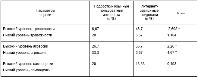 Из таблицы 3 видно, что значимы различия между группами подростков по трём из шести параметров: высокий уровень тревожности, высокий и низкий уровень агрессии. Среди подростков зависимых от интернета значительно больше тревожных и агрессивных, в то время как подросткам – обычным пользователям интернета свойственен низкий уровень агрессии. Подытоживая полученные результаты, констатируем, что у подростков с интернет-зависимостью преобладают следующие психологические особенности личности: