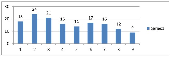Рис. 1. Средние значения показателей копинг-стратегий преодоления стрессовых ситуаций по С. Хобфоллу в адаптации Н.Е. Водопьяновой, Е.С. Старченковой Примечание: 1 – ассертивные действия; 2 – вступление в социальный контакт; 3 – поиск социальной поддержки; 4 – осторожные действия; 5 – импульсивные действия; 6 – избегание; 7 – манипулятивные действия; 8 – асоциальные действия; 9 – агрессивные действия Наиболее выраженными копинг-стратегиями являются «Вступление в социальный контакт» (М=24, SD=4,5), «Поиск социальной поддержки» (М=21, SD=3,2), «Ассертивные действия» (М=18, SD=4,1), «Избегание» (М=17, SD=4,2). Необходимо отметить, что первые три копинга являются просоциальными, активными, «избегание» - пассивная стратегия, при этом не провоцирующая конфликты. Асоциальные и непрямые стратегии не выражены. На рисунке 2 представлены средние значения симптомов эмоционального выгорания по методике В.В. Бойко.