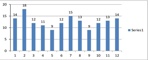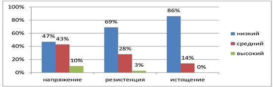 Рис. 2. Средние значения симптомов эмоционального выгорания по методике В.В. Бойко Примечание: 1 – переживание психотравмирующих обстоятельств; 2 – недовольство собой; 3 –загнанность в тупик; 4 – тревога и депрессия; 5 – неадекватность выбора эмоционального реагирования; 6 – эмоциональная дезориентация; 7 – расширение сферы экономии эмоций; 8 – редукция профессиональных обязанностей; 9 – эмоциональный дефицит; 10 – эмоциональное отчуждение; 11 – личное отчуждение; 12 – психосоматические нарушения 9 и менее баллов — не сложившийся симптом, 10-15 баллов — складывающийся симптом, 16 и более — сложившийся. Симптомы с показателями 20 и более баллов относятся к доминирующим в фазе или во всем синдроме «эмоционального выгорания». При анализе сформированности фаз (стадий) эмоционального выгорания необходимо отметить распределение респондентов: у 37% (45 человека) ни одна из фаз не является сложившейся, также не обнаружены связи со стажем работы и возрастом (таблицы сопряжения, ХИ-Квадрат, р>5%); 63% респондентов распределились между фазами в среднем и высоком диапазоне. Сформированность на высоком уровне в фазе напряжения выражена у 10% педагогов, в фазе резистенции у 3%, в фазе истощения у 0 (их 78 человек). Результаты представлены на рисунке 3.
