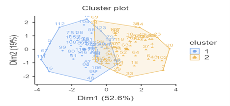 Рис. 3. Уровни сформированности фаз (стадий) эмоционального выгорания (В. В. Бойко «Эмоциональное выгорание») Обобщая данные рисунков 2 и 3, констатируем, что в фазе напряжения сложившимся симптомом является недовольство собой, складывающимися - переживание психотравмирующих ситуаций, загнанность в тупик, тревога. Фаза напряжения сформирована у 10 % выборки, средние показатели фазы у 43% выборки, в остальных случаях эта фаза не сформирована. В фазе резистенции наиболее выраженный симптом «Расширение сферы экономии эмоций» (эмоциональная замкнутость, отчуждение, желание прекратить любые коммуникации), при этом сохраняется контроль проявления настроения на профессиональные отношения. В фазе истощения самым ярким симптомом является психосоматическое нарушение: расстройства сна, головная боль, проблемы с давлением, при это сохраняется эмпатия и эмоциональная чувствительность. Для анализа выборки по преобладанию активных просоциальных копинг-стратегий проведена процедура кластеризации. Основаниями для деления послужили выделенные в методике Хофболла копинг-стратегии. При помощи кластерного анализа (кластеризация К-средними) педагоги были разделены по представленности копинг-стратегий на два кластера: активные просоциальными (N=71) и пассивные асоциальные (N=52) относительно выборки. Кластеры отображены на рисунке 4.