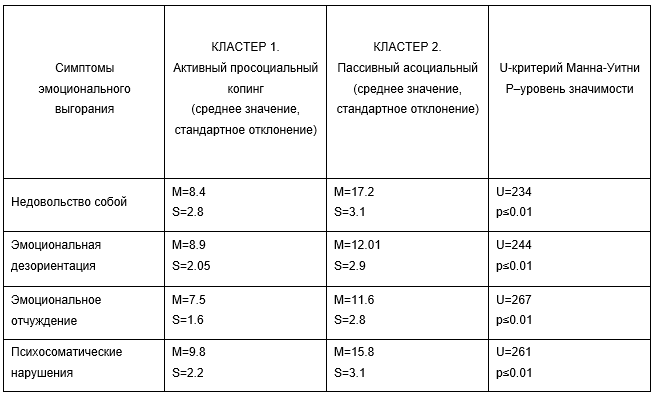 Рис. 4. Кластеры предпочитаемых копинг-стратегий Педагоги с активными просоциальными копинг-стратегиями обладают значимо более высоким уровнем ассертивных действий (U=4092, p≤0.001), умением вступать в социальный контакт (U=4780, p≤0.05), выше поиск социальной поддержки (U=0.400, p≤0.001). Педагоги кластера 2 обладают значимо более высоким уровнем избегания (U=3724, p≤0.001) и агрессии (U=4123, p≤0.05). По уровню представленности осторожных действий, импульсивности, манипулятивных действий и асоциальных действий различий между выделенными кластерами не обнаружено (U=4886, p>0,05). Заключительный этап исследования: сравнение выделенных кластеров по симптомам эмоционального выгорания. Значимые различия между кластерами получены при помощи U-критерия Манна-Уитни по 4 симптомам (U, p≤0.05).Сравнение кластеров по преобладанию симптомов эмоционального выгорания представлено в таблице 1. Таблица 1 Проявление симптомов эмоционального выгорания в разных кластерах