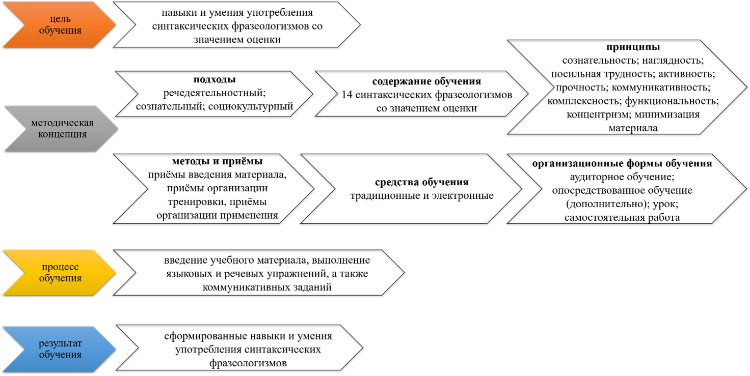 Рис. 1. Схема системы обучения синтаксическим фразеологизмам Заключение Для разработки методики преподавания СФ необходимо было системно рассмотреть всё, что относится к процессу обучения этим единицам. Такая цель была поставлена, и она была достигнута. Нами была разработана и описана система обучения синтаксическим фразеологизмам со значением оценки. В ходе проведения исследования было сделано следующее: а) обозначены цель и задачи обучения СФ; б) описаны подходы, принципы, методы, средства и организационные формы обучения; в) описан процесс формирования навыков и умений, который включает 3 компонента; г) представлена система упражнений и заданий; д) в систему включены результаты обучения, которые согласованы с целью. Разработанная система обучения может применяться в иностранной аудитории
