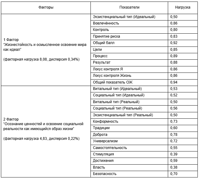 Abstract Key words: lifestyle, personal characteristics, value-semantic orientations, factor analysis, student youth. ---------------- Представление о смысле значимо только для человека, так как только он способен различать критерии истинного и ложного. Это возможно благодаря присутствию у человека речи, мыслительной деятельности и произвольности, определяемые наличием сознания [1]. Самосознание же формируется постепенно, а вместе с ним происходит осмысление жизни, как смысложизненное самоопределение. Человек принимает те смыслы, которые упорядочивают внутренний мир, открывая бесконечную перспективу жизненного пути [2]. Отечественные психологи считают, что для поиска смысла жизни обязательно наличие «субъект – объектных» отношений [3, 4], где субъект выделяет и противополагает объект. Таким объектом для человека является природа, социальное окружение и трансцендентная реальность. В. И. Несмелов писал, если в самосознании доминируют элементы эмпирической реальности, то мотивы деятельности определяются принципом гедонизма [5]. Если в самосознании преобладают духовные элементы, тогда мотивом деятельности становится принцип смысла жизни. Внутренний конфликт между внутренне-идеальным человеком с внешне-эмпирическим продолжается всю жизнь. В итоге этот выбор придает различную ценность жизни. В. И. Несмелов считал, что варианты понимания смысла жизни представлены в трех философских учениях: гедонизме, прагматизме и идеализме [5]. Смысл жизни является фундаментом человеческого бытия. Поэтому нельзя искать смысл жизни в реализации какого-либо дела, что создает иллюзию способности творить смысл жизни, считал С. Л. Франк [6]. Несмелов указывал, что смысл невозможно придумать, его можно только отыскать. Человеку доступно создание краткосрочных, промежуточных целей. Их быстрая реализация и частая смена обессмысливает человеческую жизнь, формируя невроз «достижения цели» или переживание «экзистенциального вакуума», о котором писал В. Франкл [7]. К теме смысла жизни также часто обращались психологи гуманистического направления. А. Маслоу предложил термин «самоактуализирующаяся личность», пытаясь придать человеку осмысленность существования [8]. Самоактуализирующаяся личность у А. Маслоу характеризуется тем, что у нее ничего не отнято и не добавлено, что предполагает охранную деятельность своего от притязания других, и в этом смысл жизни. В нашем эмпирическом исследовании мы старались опираться на отечественные концепции смысложизненного самоопределения.в связи с чем целью исследования стало выявление личностных и ценностно-смысловых факторов формирования эталона жизнедеятельности у современной молодежи. Исследование было проведено с участием 337 испытуемых (75% женщин, 25% мужчин), средний возраст 19,5 (ст. отклонение 3,04). Исследовательская гипотеза - специфические личностные особенности и ценностно смысловые факторы обеспечивают становление различных эталонов жизнедеятельности. Диагностический комплекс включил: 1) ценностный опросник Ш. Шварца; 2) тест жизнестойкости С. Мади (в адаптации Д. Леонтьева); 3) тест смысложизненных ориентаций (СЖО, адаптация: Д. А. Леонтьев); 4) методика «Эталон жизнедеятельности» М.Я. Дворецкой [9]. Для статистического анализа был использован факторный анализ (метод главных компонент, с последующим ортогональным вращением матрицы данных). В результате фактор