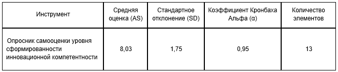 Необходимость ведения современным педагогом инновационной профессионально-ориентированной деятельности выразилась в попытках учёных разных стран выявить компоненты названной деятельности и структурировать саму инновационную компетентность. В частности, Жуан А. Марин-Гарсия и другие в исследовательской работе "How to assess innovation competence in services: The case of university students" представляют трёхкомпонентную модель инновационной компетентности будущих педагогов. В рамках названной компетентности авторы выделяют персональный, интерперсональный и сетевой компонент. Последний компонент учитывает способность сотрудничать с людьми из разных стран, разных культур и происхождения, а также способность получать или создавать коммуникационную связь [3]. Очевидно, что данная модель ориентирована на индивидуально-сетевой локус, поэтому может быть интересна для социально-ориентированных исследований. Ученый из Дании Ж.А. Нильсон предпринял исследование, которое позволило разработать пятикомпонентную структуру инновационной компетентности. Названная структура охватывает следующие субкомпетенции: творческую, коллаборативную, навигационную, деятельностную и коммуникативную [4]. Полагаем, что автор названной концепции также, как и предыдущий автор отдаёт предпочтение социально-коммуникативным составляющим, ориентированным на профессионально-корпоративную и профессионально-технологическую стороны инновационной деятельности. M.C. Тарамова и др. в своих работах, описывая инновационную компетентность преподавателей, идёт далее и помимо социально-коммуникативных аспектов выделяет аксиологические и индивидуально-деятельностные её компоненты. В частности, в работе исследованы мотивационно-ценностный, креативный, технологический (операционный) и рефлексивный компоненты [5]. Данная трактовка представляется более обоснованной в аспекте деятельностной составляющей развития профессионального мастерства и видится более компонентно сбалансированной в отношении перспективного развития творчески-маркированных компетенций педагога. Основываясь на мнении учёных, представленных выше, а также на результатах собственного предпринятого исследования, полагаем, что структура инновационной компетентности педагогов должна включать в себя компетенцию в саморазвитии, профессиональной адаптивности, инновационно-методическую, ценностно-экологическую, научно-исследовательскую, коллаборативную, межкультурную коммуникативную, рефлексивную, компетенцию в использовании технологий искусственного интеллекта, а также в инновационном мышлении и решении педагогических проблем. Анализ текущего состояния уровня сформированности инновационной компетентности педагогов вузов выявил существующие проблемы и позволил разработать практические рекомендации по её дальнейшему формированию и развитию. В целях выявления уровня сформированности искомой компетентности были предприняты исследовательские мероприятия, одним из которых стало проведение опроса, нацеленного на самоопределение педагогами уровня сформированности отдельных компонентов инновационной компетентности. Для реализации данной задачи был разработан «Опросник самооценки уровня сформированности инновационной компетентности преподавателя иностранного языка высшего образователь