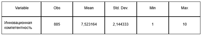 Таблица 1 свидетельствует о том, что шкала оценки инновационной компетентности преподавателей вуза имеет высокую и приемлемую достоверность (Kronbach α = 0,95). Данные, полученные с помощью этого метода, показывают, что самостоятельно разработанный для целей данного исследования опросник имеет валидные психометрические характеристики и научно-корректен для оценки уровня сформированности компетенций преподавателя. Задействование в исследовании опросника позволило определить, что средняя оценка (mean) респондентов по шкале от 1 до 10 при оценке их понимания уровня сформированности инновационной компетентности составляет 7.5 (таблица 3). Стандартное отклонение (SD) составило 2,14 и это означает, что в оценках есть определенные различия: часть преподавателей (72%) достаточно осведомлены о понятии «инновационная компетентность», остальные – осведомлены лишь частично. Таблица 2 Уровень информированности преподавателей иностранных языков высших образовательных учреждений об инновационной компетентности