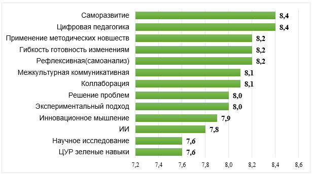 Далее проанализируем уровень сформиированности компонентов инновационной компетентности (рис. 1). В целом, уровень сформированности всех компонентов инновационной компетентности преподавателей находится в достаточно плотном диапазоне – от 7,5 до 8,5 баллов по среднему значению. Однако при сравнительном анализе наблюдаются определённые различия: некоторые компоненты, такие как компетенция в использовании технологий искусственного интеллекта, демонстрируют относительно более низкий уровень сформированности по сравнению с другими, например, цифровой грамотностью или способностью к педагогическим инновациям. По результатам предпринятого автором опроса наиболее высоко была оценена сформированность в следующих компонентах инновационной компетентности: