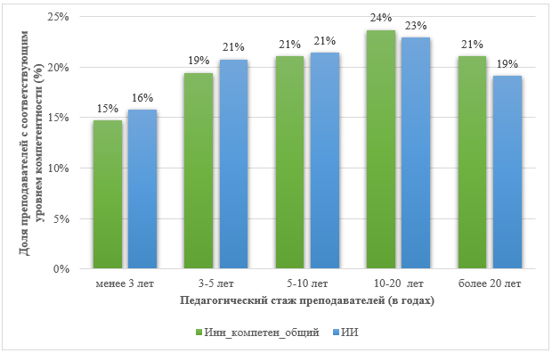 Рис. 2. Уровень сформированности инновационной компетентности и компетенции в использовании ИИ в зависимости от педагогического стажа Кроме того, в рамках исследований была проанализирована самооценка преподавателей иностранных языков в области применения инновационных технологий, а именно – применения технологий искусственного интеллекта (ИИ). Диаграмма (рис.2) отражает уровень сформированности инновационной компетентности преподавателей (Инн_компетен_общий) и её составного компонента — компетенции в использовании технологий искусственного интеллекта (ИИ) в зависимости от педагогического стажа респондентов. Анализ полученных данных показал, что наивысший уровень инновационной компетентности наблюдается у преподавателей со стажем от 10 до 20 лет (24 %), что указывает на положительную связь между опытом и инновационным потенциалом. Компетентность в области ИИ во всех категориях остаётся либо на уровне общей инновационной компетентности, либо несколько ниже, что свидетельствует о недостаточной развитости данного компонента. Особенно выражено это среди преподавателей со стажем более 20 лет, у которых показатель ИИ-компетентности составляет лишь 19 %, что может указывать на определённые трудности в адаптации к цифровым инновациям. В то же время преподаватели с опытом менее 3 лет демонстрируют более высокий уровень компетентности в ИИ по сравнению с общей инновационной компетентностью, что говорит о большей открытости молодых специалистов к современным технологиям. В целом, результаты анализа подчеркивают необходимость развития компетенции в области использования искусственного интеллекта в профессиональной деятельности, особенно среди педагогов с длительным стажем. Анализ показал, что несмотря на осознание важности инноваций в образовательном процессе, уровень сформированности инновационной компетентности у многих преподавателей иностранных языков вузов остается недостаточным. Основными препятствиями выступают немногочисленное использование современных методических ресурсов и недостаточная подготовка в области цифровых технологий. Предпринятый опрос продемонстрировал, что преподаватели считают себя слабыми в таких сложных и современных аспектах инновационной компетентности, как научная деятельность, устойчивое развитие и интеграция технологий искусственного интеллекта.