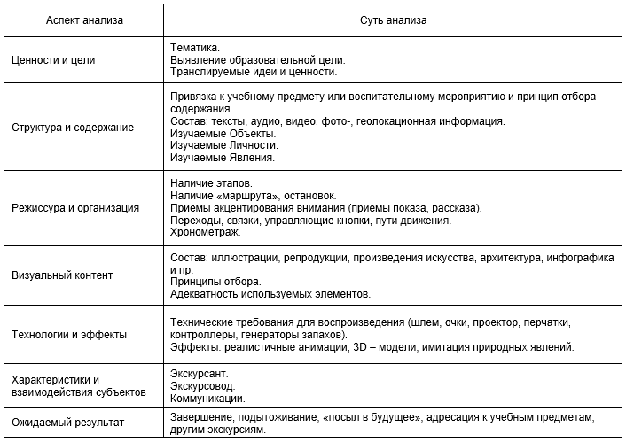 Abstract Key words: virtual tour, guided tour, virtual reality, values, visual content, analysis matrix. ---------------- В современном мире цифровые технологии стали активно применяться во всех сферах жизни, включая образование и культуру. Одним из ярких примеров использования цифровых технологий в образовании является создание виртуальных экскурсий (далее ВЭ). ВЭ используются как средства обучения и воспитания школьников, поскольку решают множество задач, таких как: расширение кругозора, детализированное усвоение материала, способствующее развитию личности в интеллектуальном плане, а также являются инструментом для формирования гражданских качеств и ценностей у школьников [1]. ВЭ соответствуют актуальным требованиям к формам обучения и воспитания в современной школе, но при этом наблюдается бессистемность их использования в педагогике. Анализ источников, связанных с тематикой ВЭ, используемых в качестве проектной, профориентационной деятельностей, методик, в которых такие экскурсии рассматриваются в качестве средства, способа, формы и метода обучения и воспитания, показывает, что нет единого подхода к трактовке ВЭ и её структуры в школьном образовании, а также выявлена недостаточность методического обеспечения создания и реализации таких экскурсий. Анализ работ Александровой Е.В., Аквилевой Г.Н., Гориной С.Г. Козиной Е.Ф., Мелехиной В.В., Околелова А.Ю. Смоляковой Е.С. и других авторов [2, 3, 4, 5, 6] позволил вывести рабочее определение ВЭ. Под ВЭ в настоящем исследовании понимается форма обучения и воспитания, которая, при сохранении сущности экскурсии, позволяет преодолеть физические, географические и социальные границы за счет воспроизведения и отражения объектов, явлений и процессов в цифровых условиях, а также создает условия для самостоятельного наблюдения, углубленного анализа и обработки учащимися получаемой информации. Е.И. Карташева, Л.Т. Аглиуллина в своем методическом пособии, рассматривают понятие «экскурсия» как «культурно-образовательное мероприятие, во время которого осуществляется целенаправленный осмотр достопримечательных мест, архитектурных сооружений, памятников природы, музейных экспозиций и других объектов, по заранее определенной теме и выбранному маршруту» [7]. На основании вышерассмотренного понятия «экскурсия» в контексте культурно – образовательного пространства, можно выделить основные характеристики традиционных экскурсий, которые отличают данную экскурсию от других форм ознакомления с объектами и явлениями. К характеристикам традиционных экскурсий относят: организованность (экскурсовод и экскурсанты); режиссуру - продвижение экскурсантов по заранее проложенному маршруту; акцентирование и тематически обусловленный показ экскурсионных объектов экскурсоводом; целенаправленность осмотра экскурсионных объектов экскурсантами; продуманность и обеспечение зрительного восприятия (просмотр объекта с разных сторон); хронометрия [7]. Экскурсия является «погружением» субъекта в специально организованную среду по целенаправленно разработанному сценарию при непосредственном коммуницировании экскурсантов с экскурсоводом как проводником в этой среде. Также можно отметить присущие ей свойства событийности: достаточно представить, с каким нетерпением школьники ожидают экскурсию и предвкушают получение незабываемых впечатлен