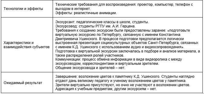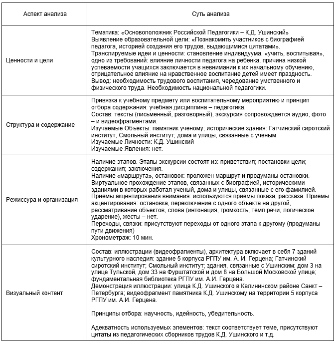 В процессе проведения исследования были использованы и проанализированы готовые материалы виртуальных экскурсий студентов 2-4 курсов в рамках проведения Герценовской олимпиады «Педагогические ориентиры» - 2023. Программа олимпиады проводилась в три тура и была посвящена Году педагога и наставника. Один из туров заключался в выполнении коллективного домашнего задания «Цветы Ушинскому». Формулировка задания заключалась в подготовке виртуальной экскурсии по Санкт-Петербургу и Ленинградской области, связанную с именем Константина Дмитриевича Ушинского. В качестве результата «предполагается логически выстроенная презентация социокультурных объектов Санкт-Петербурга и Ленинградской области, связанных с именем К.Д. Ушинского, с использованием аудио и видео сопровождения» [9]. На основании анализа данных материалов была разработана методика.Полученные результаты и возможности использования методики в исследовании позволили выделить три основных пункта: